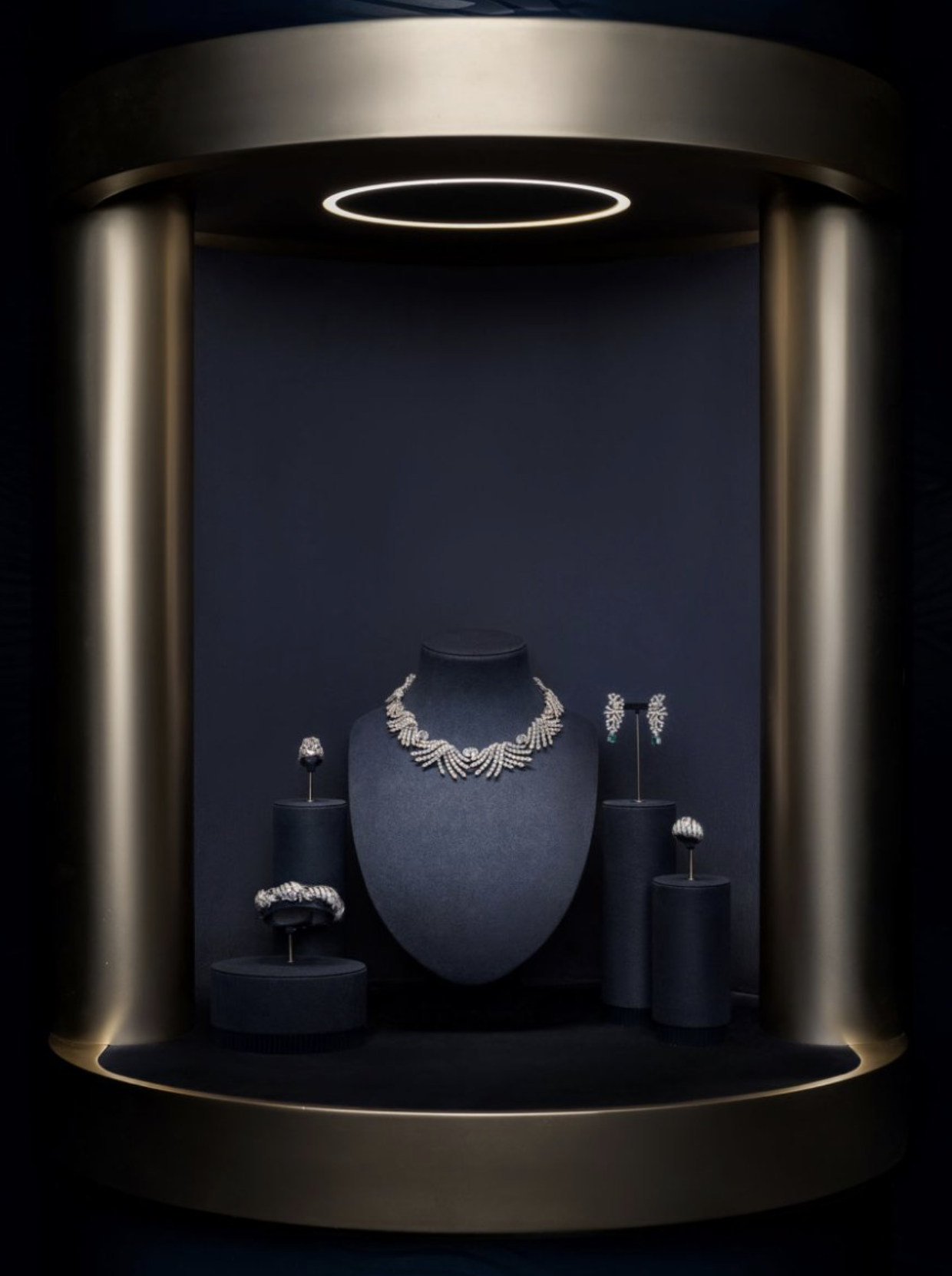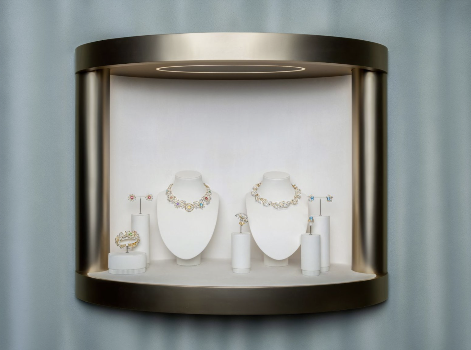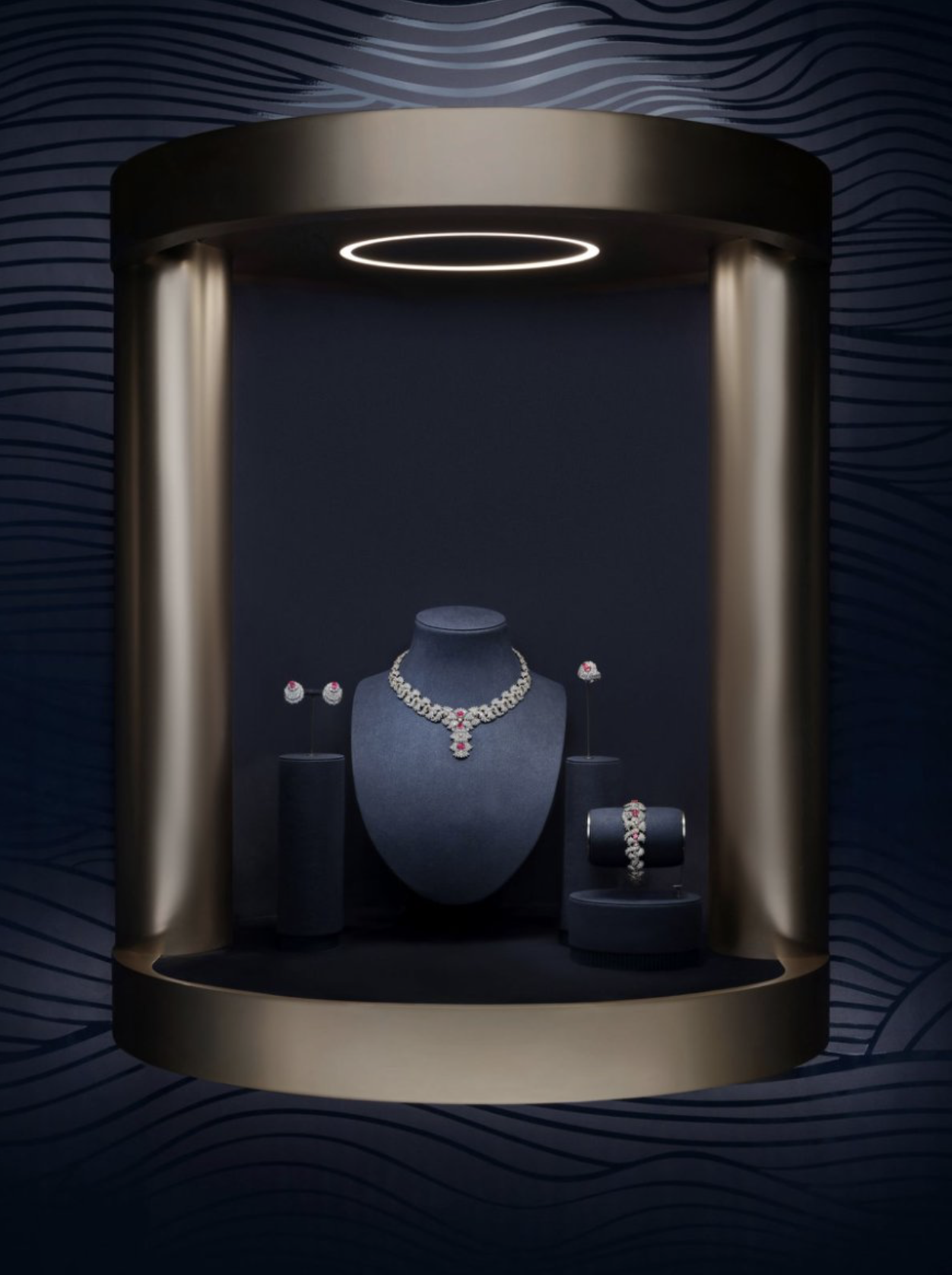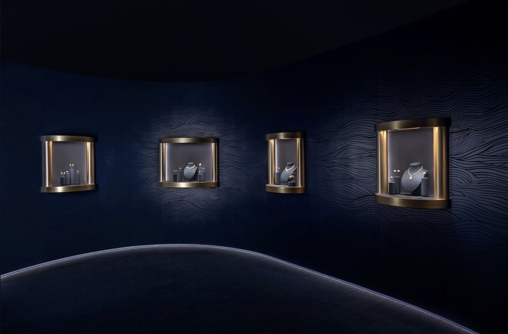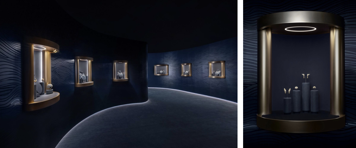 受该系列主题启发,2025 Blue Book高级珠宝系列 Sea of Wonder 瑰海奇珍作品悉数陈列于深蓝色调与波纹图案交织的空间之中。