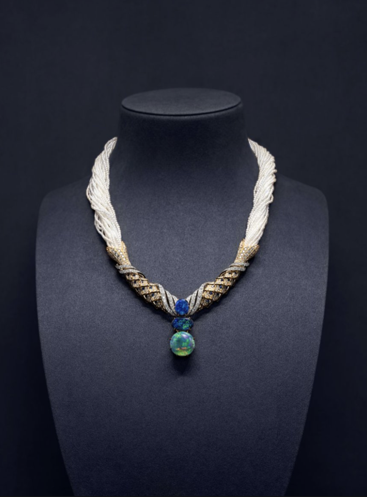 海灵仙姿(Mermaid)主题则探索美人鱼的韵味风姿,其中一款镶嵌黑色欧泊的项链更是以抽象手法展现美人鱼神秘而梦幻的魅力。每一件作品皆以珍罕宝石与非凡匠艺,焕新演绎让·史隆伯杰对海洋世界的绮丽创想。
