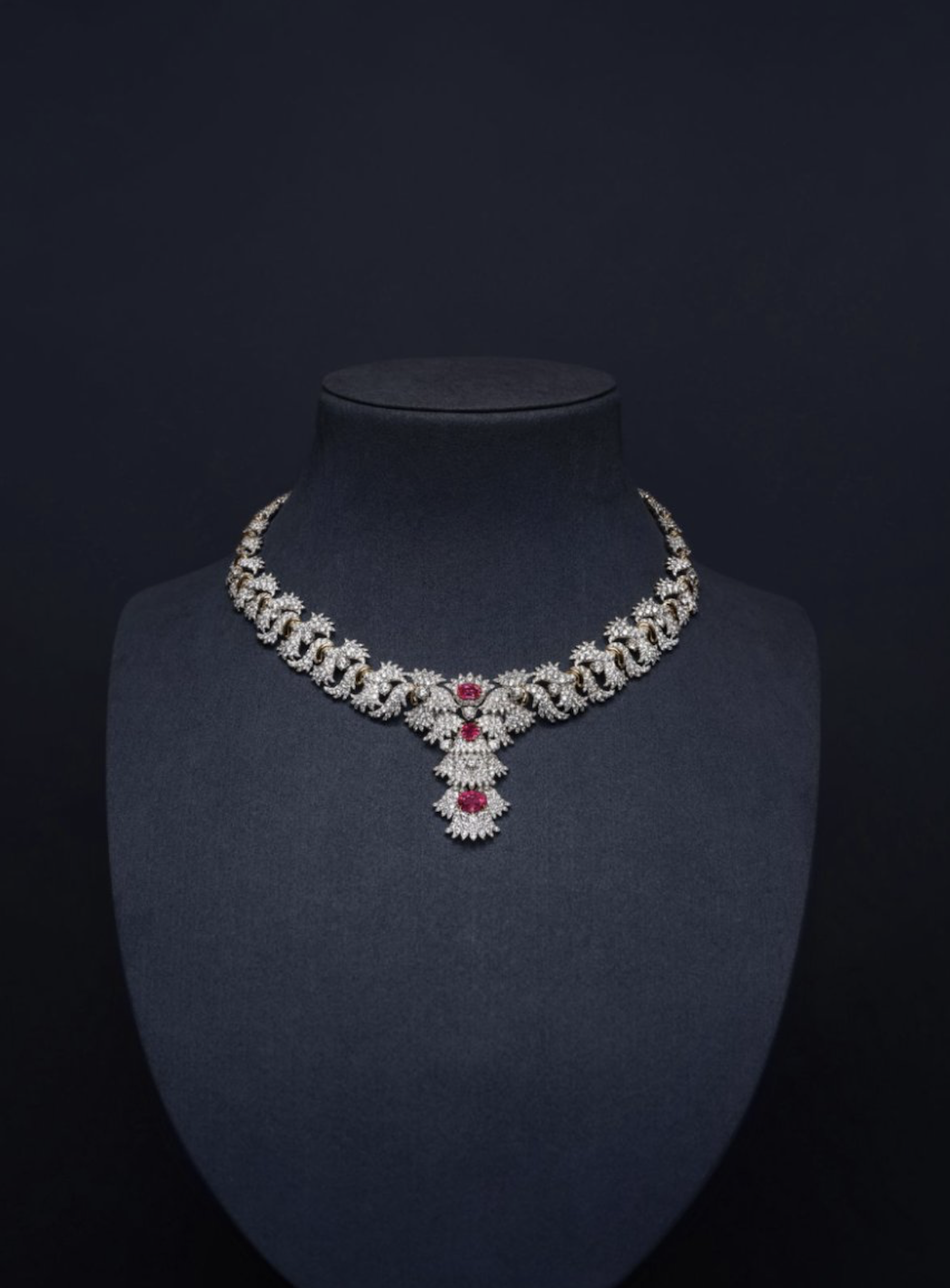 花舞海葵(Anemone)主题的灵感源自让·史隆伯杰一系列妙趣横生的海葵胸针设计,系列作品洋溢着灵动韵律与奇思妙想,其中一款项链更是在三颗未经优化处理红宝石的点缀下,尤为瞩目。