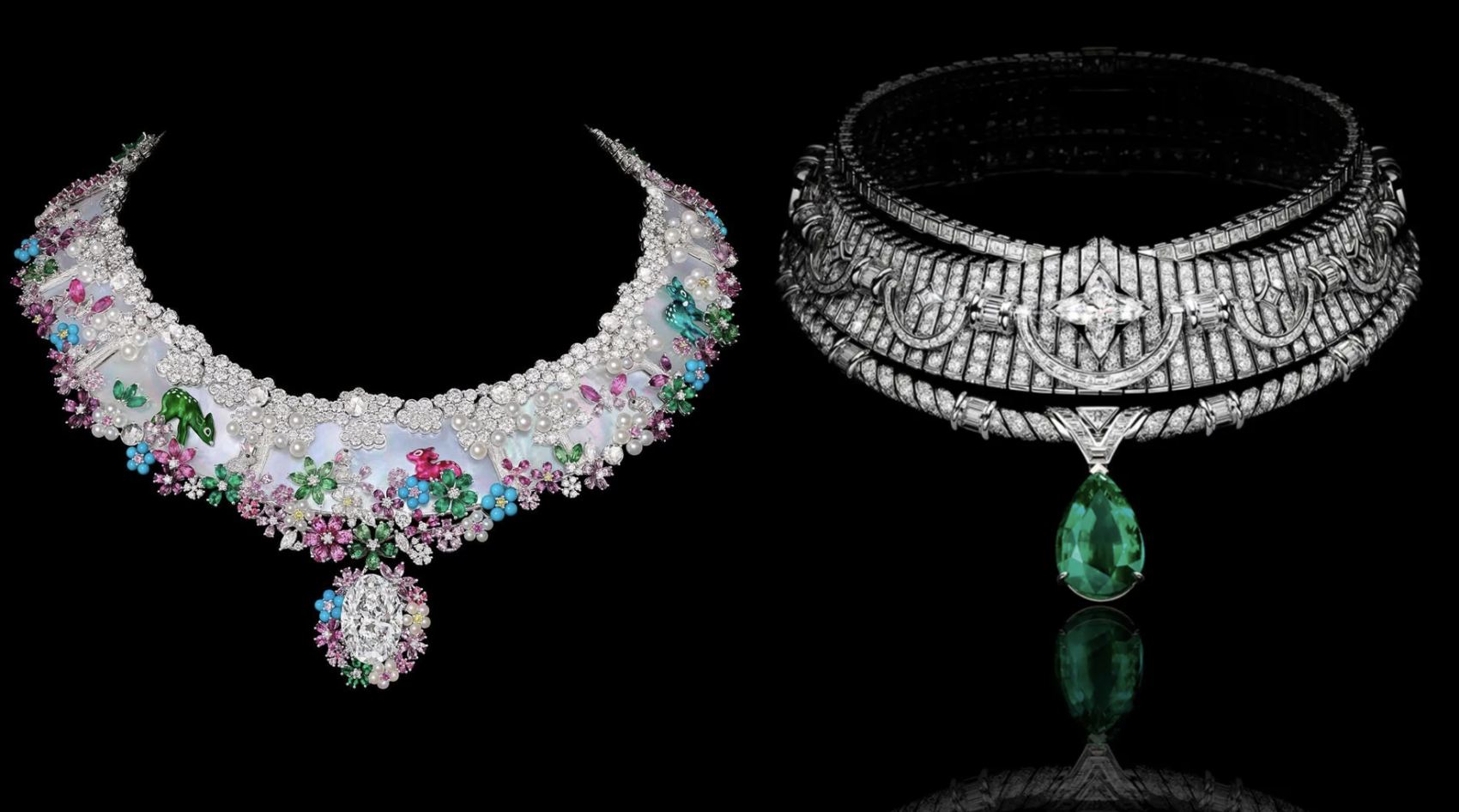 其中,香奈儿的 Sweater Prestige Necklace 源自香奈儿高级运动珠宝系列(Haute Joaillerie Sport),总重量达37.18克拉,其18K 白金与铂金材质打造的底座上镶嵌了钻石、缟玛瑙及11颗祖母绿。