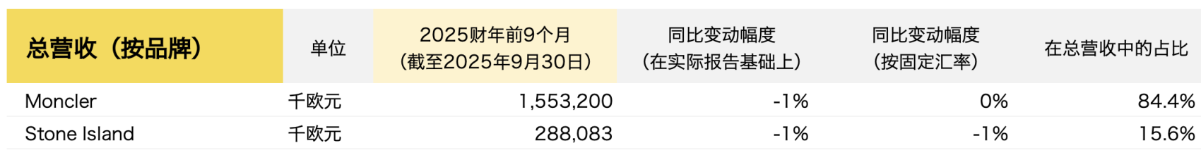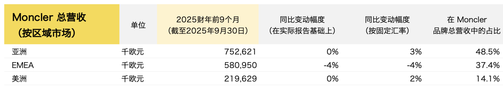 10月28日,意大利奢侈品企业 Moncler Group(盟可睐集团)公布了截至2025年前九个月的关键财务数据:总营收同比下降1%至18.413亿欧元(按固定汇率计算与去年同期持平);受欧洲和日本旅游需求疲软影响,第三季度营收按固定汇率计算同比下降1%至6.156亿欧元,但高于分析师预期的6.04亿欧元。其中,Moncler品牌在亚洲市场(占集团总营收约一半)保持稳定,中国市场继续表现优于该地区其他国家,而日本和韩国市场表现疲弱。