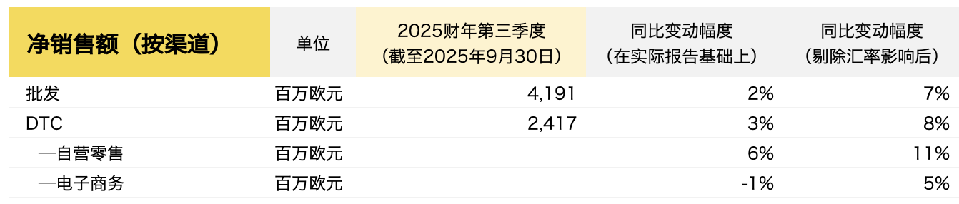 品牌净销售额在所有渠道均实现两位数同比增长。零售合作伙伴门店的高销售转化率和增加的货架空间持续推动批发收入,按固定汇率计同比增长10%。自营零售收入同比增长13%,得益于公司全球门店同店销售强劲增长以及对零售门店的持续投资。电子商务销售同比增长15%,继续聚焦全价产品,同时在去年同期基础上实现了超过25%的增长。因此,品牌净销售额DTC渠道在第三季度同比增长14%。