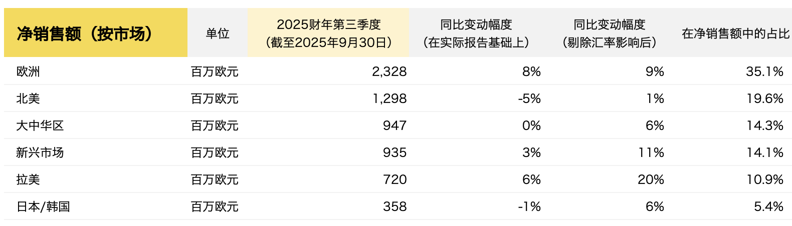 就地区来看,受美元疲软影响,北美地区销售额同比下降5%,是公司表现最差的市场。