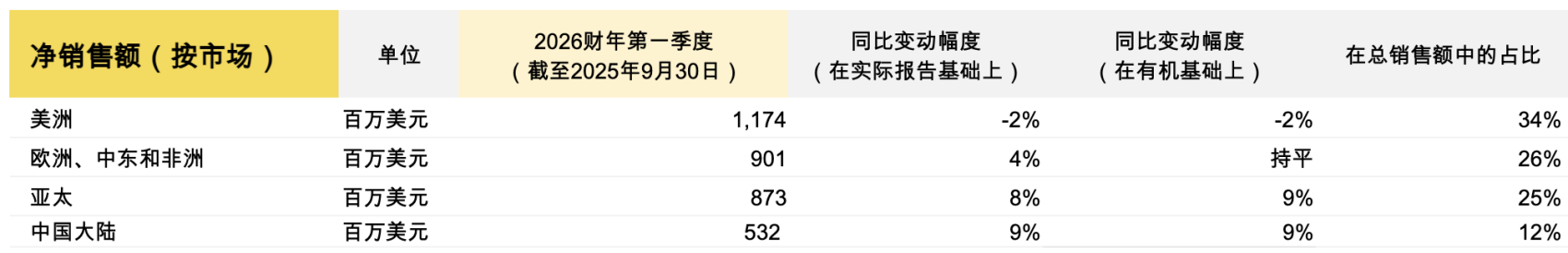 中国大陆市场的增长主要得益于创新产品与现有产品的双重驱动,消费者覆盖的针对性扩大,以及助力线上增长的重点营销活动。与此同时,销售额提升及利润恢复与增长计划带来的效益也带动了中国区营业收入的增长。