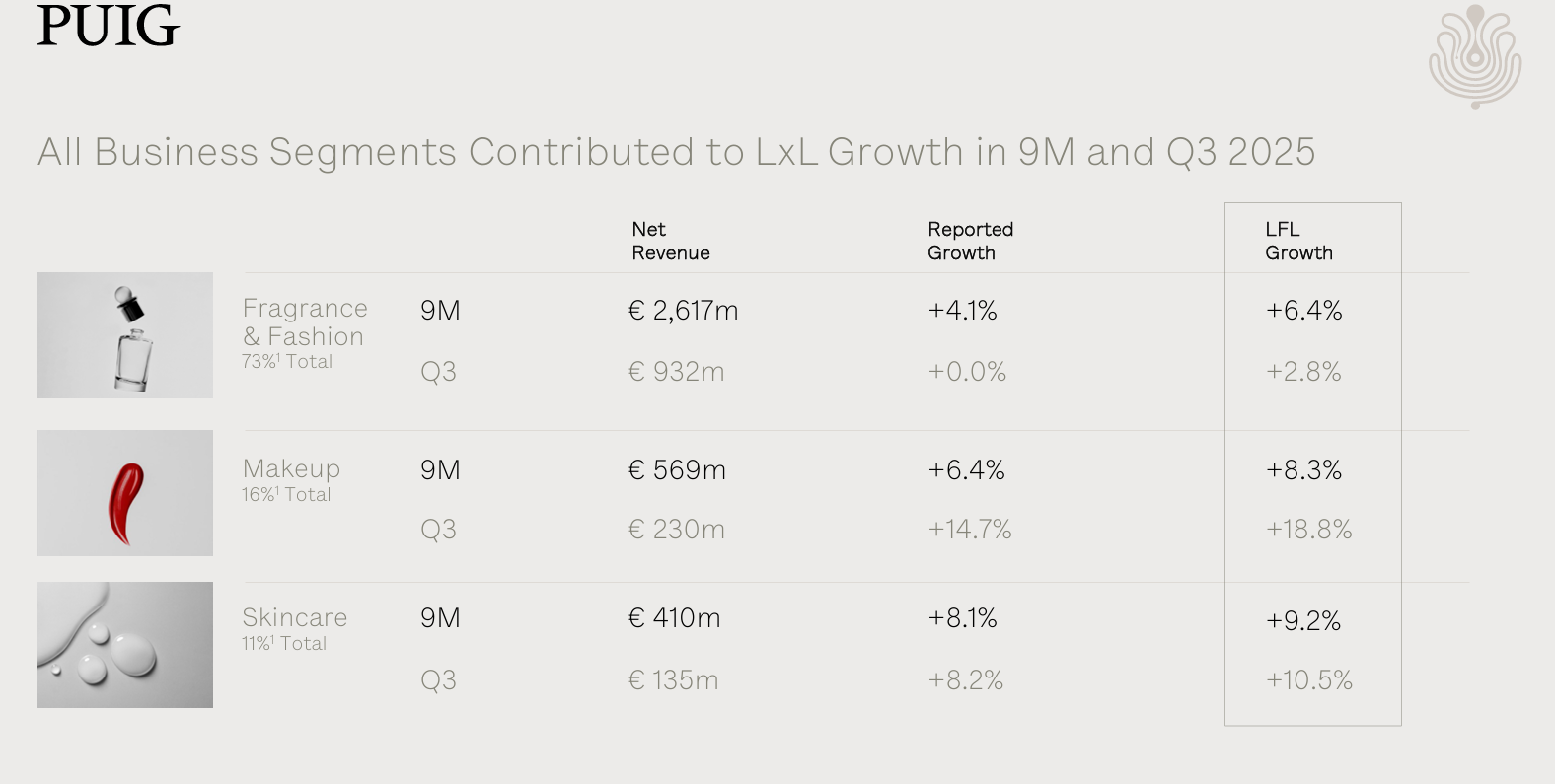 10月30日,西班牙香水美容和时尚集团 Puig 发布了截至2025年9月30日的第三季度业绩数据:得益于强劲的第三季度销售表现,集团预计2025年全年业绩将达到6%至8%增长区间的的中位数,超出市场普遍预期。