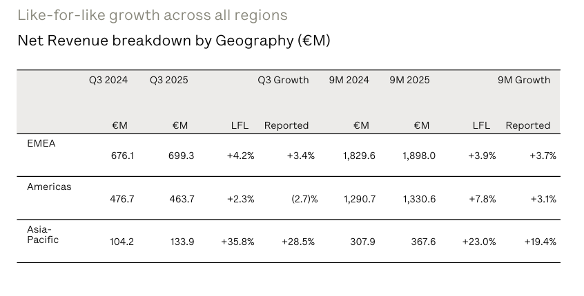 - 欧洲、中东和非洲地区贡献了 53%的净销售额,达到6.9亿欧元,同店销售额同比增长4.2%;