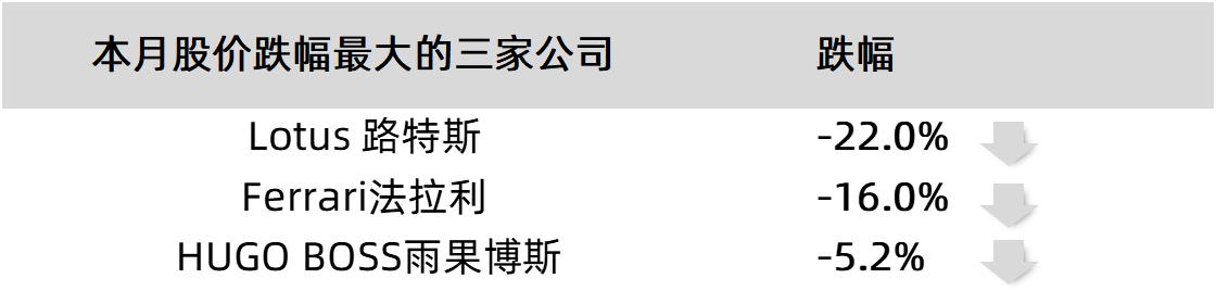 9只股票出现下跌(其中2只跌幅超过10%),分别为高端豪华电动车制造商 Lotus 路特斯(-22.0%)、意大利豪车品牌 Ferrari 法拉利(-16.0%)