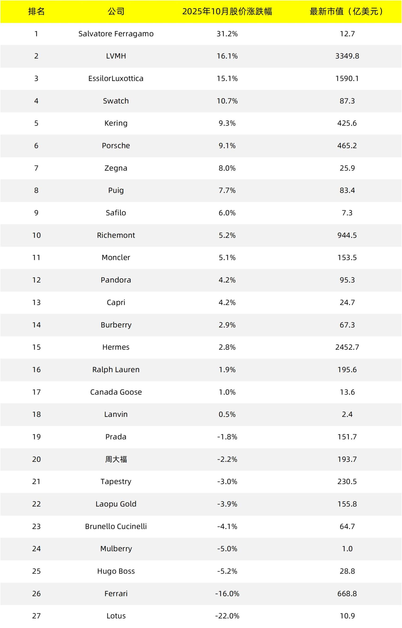 附录:2025年10月全球奢侈品上市公司的股价涨跌幅和最新市值