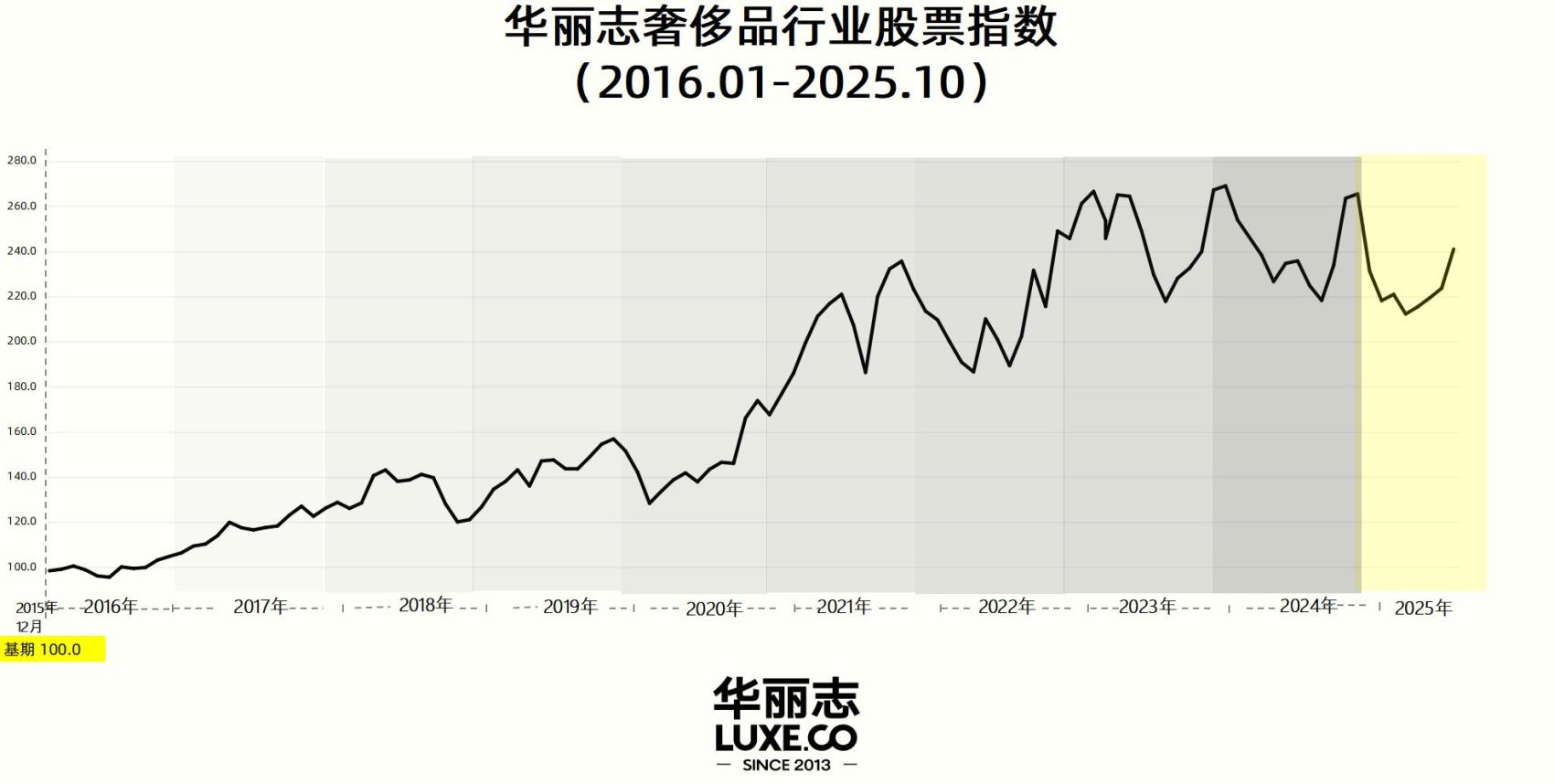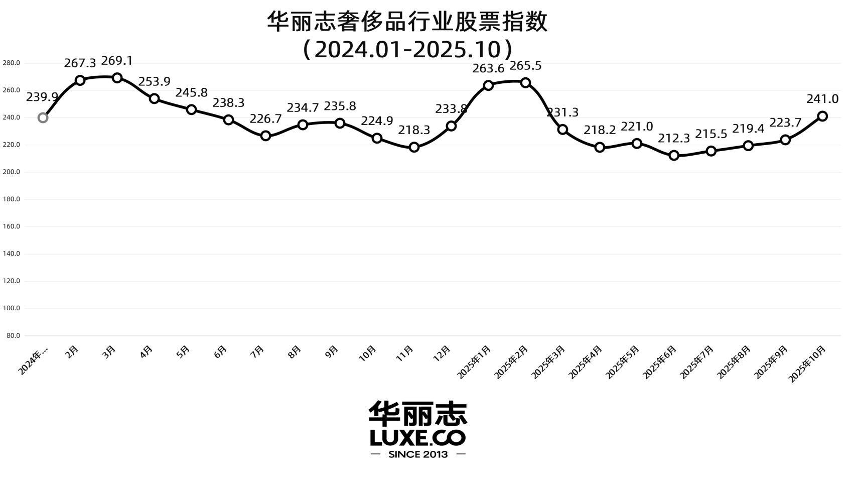“华丽志奢侈品行业股票指数”继续回暖,由9月底的223.7升至10月底的241.0,涨幅为7.7%,迎来四连涨。