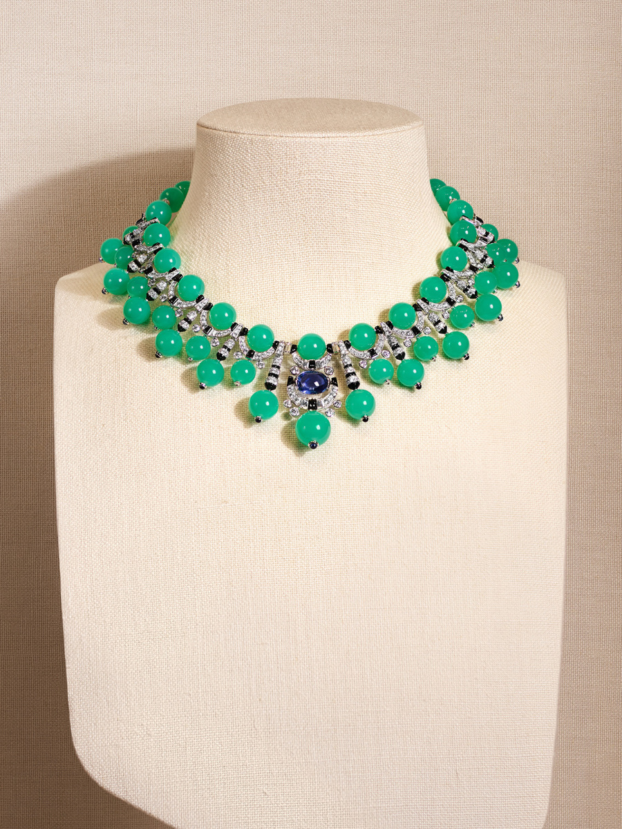 这款项链将珍贵材质与几何造型和谐相融:绿玉髓的温润色调与蓝宝石的轻盈蓝色交相辉映,白色钻石则与黑色缟玛瑙形成鲜明对比;利落线条与圆润宝石之间产生强烈张力,造就一款隽永而现代的作品。
