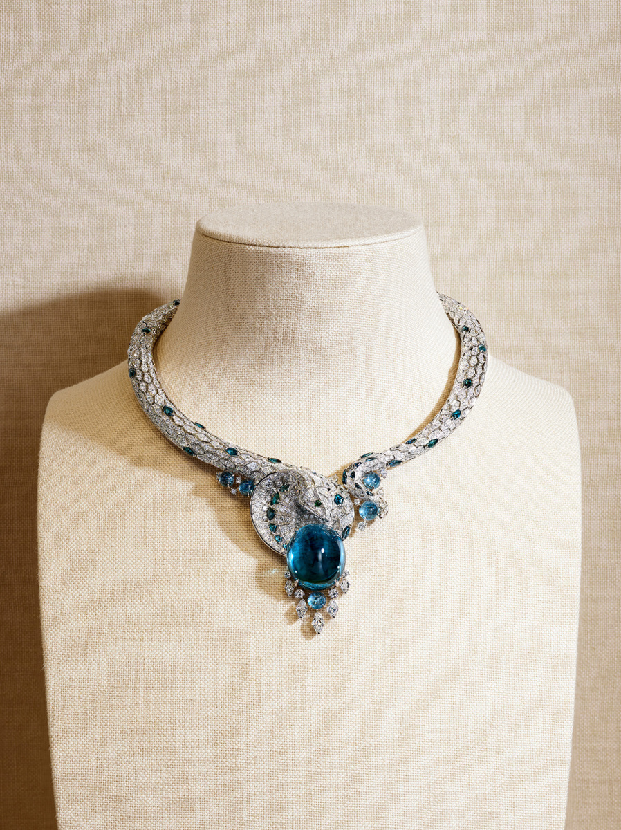 这一作品将眼镜蛇刻画得生动逼真:立体蛇首、犀利的祖母绿眼睛和几何形鳞片皆极具写实表现力。栩栩如生的蛇威严守护一颗重达51.70克拉的海蓝宝石。风筝形钻石点缀其中,增添几何美感,数颗尺寸较小的海蓝宝石和碧玺为整体注入生机,蛇尾缱绻环绕颈间,展现眼镜蛇的蓬勃活力。