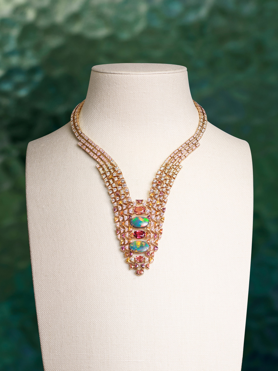 这款项链聚焦一对华美欧泊,通过丰富配色烘托其迷人虹彩。欧泊的红、橙和黄色光芒,与交错排布的三颗彩色蓝宝石相互映衬。一系列Umba蓝宝石的丰富色彩和谐交融,令温暖色调延伸至整件作品,达到精妙平衡。反复排列的几何图案延展成柔美曲线,契合中央宝石的椭圆形轮廓