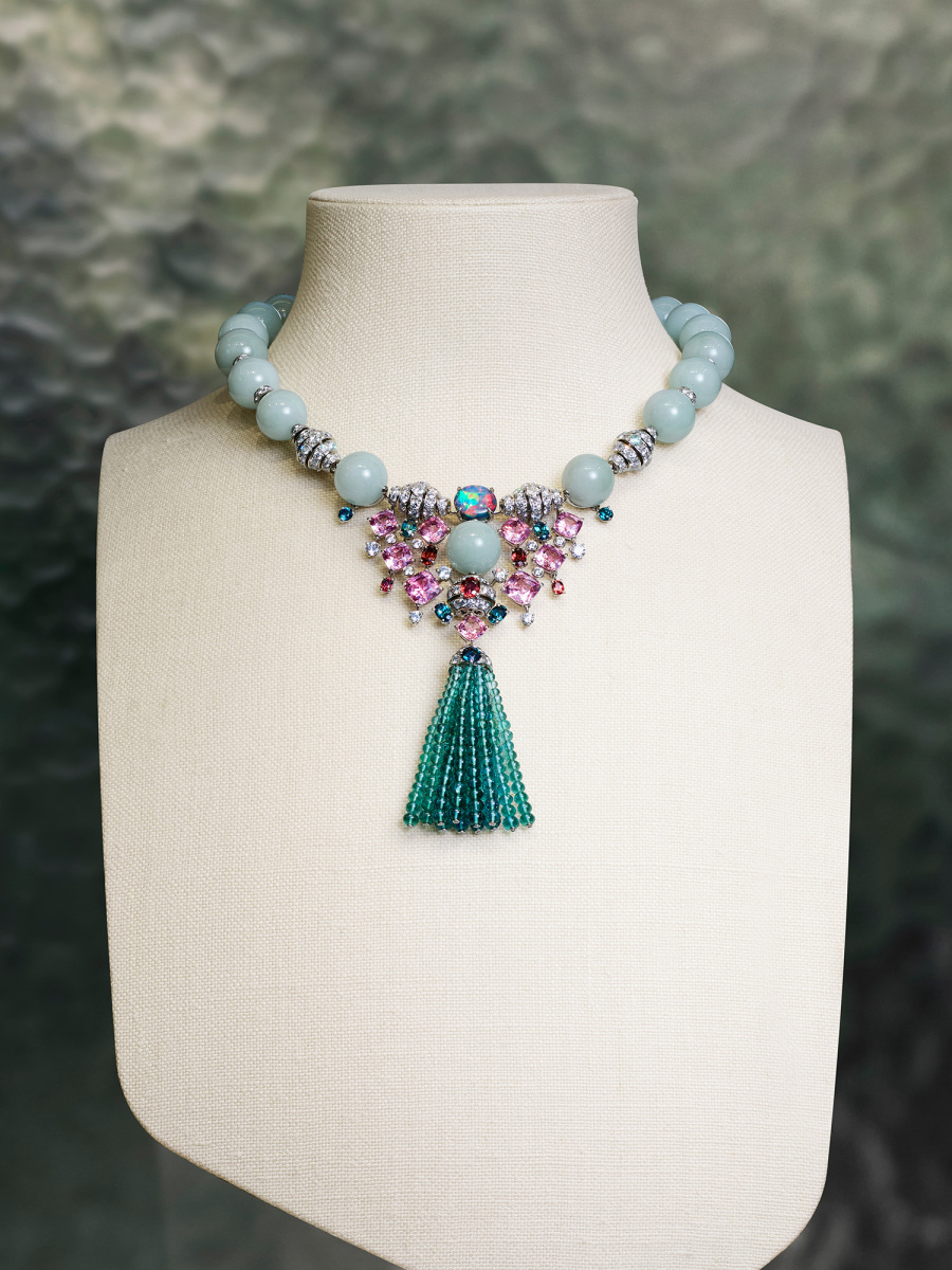 这款项链巧妙混搭翡翠圆珠、尖晶石、碧玺、欧泊与钻石等不同材质,通过几何图案与考究的镂空设计,呈现丰饶华美而又巧妙平衡的效果。柔和细腻、近乎植物般的色调与有机形态的宝石形成呼应,悬垂而下的流苏更显灵动优雅。