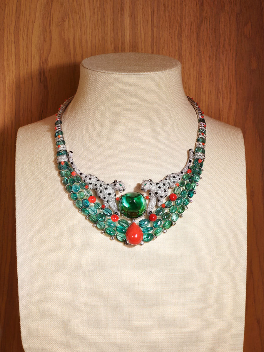 这款项链中央镶嵌一对丰盈华美的宝石:一颗74.10克拉绿色碧玺和一颗14.91克拉水滴形珊瑚,演绎卡地亚一个多世纪以来的标志性红、绿配色。得益于细致入微的串珠工艺,两侧簇拥的蓝绿色碧玺,将自然美感与对称结构和谐交融。作为卡地亚的隽永标志,两只猎豹以镜像方式相对而立,蓄势跳跃,生动逼真:从矫健的四肢、摄人心魄的祖母绿豹眼,到缀以黑色豹斑的皮毛与缟玛瑙豹爪,每处特征皆细腻入微。