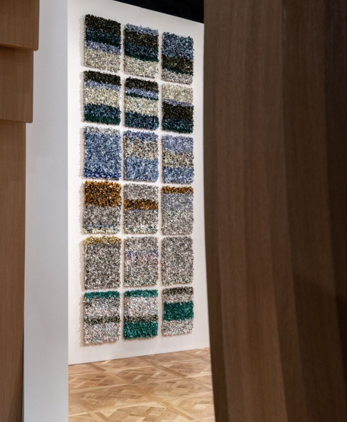 在极具现代感的迪奥展区内,四周墙面上展陈着艺术家乔尔·安德里亚诺马里索亚(JOELANDRIANOMEARISOA) 创作的大型装置艺术品“LES SAISONS IMAGINAIRES”(二零二一年)。该作品取自品牌往季的真丝丝巾,装裱于多块展板之上,构筑出层叠而富有诗意的视觉景观。作品以细腻的意象礼赞更迭与变迁,赞颂理想的共鸣力量。