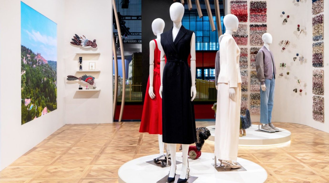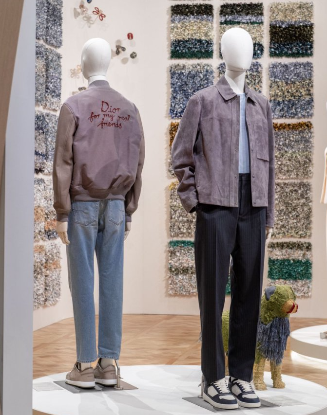 在展区中央,迪奥在本次进博会上带来了多款以可持续理念设计的产品,涵盖男装与女装成衣系列。这些作品选用经认证的可持续面料,遵循严格的环境与社会标准,从原料、工艺到制作流程皆力求降低对生态的影响。