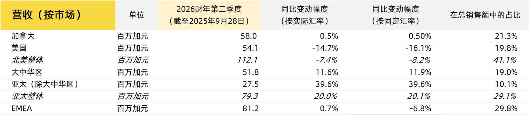 就地区来看,大中华区营收同比增长11.6%至5180万加元,推动亚太市场营收同比劲增20%至7930万加元,成为了本季度的主要增长引擎。