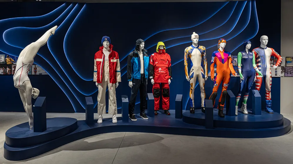 最后,观众将来到展示 FILA 广告宣传活动的空间,这里展示了品牌从早期的宣传到最新的市场推广活动,以及 FILA 如何通过与 Fendi、Y Project、Haider Ackermann、Roksanda 和 Hailey Bieber 等众多品牌的合作,发展成为一个能够跨越运动与时尚界限的品牌。