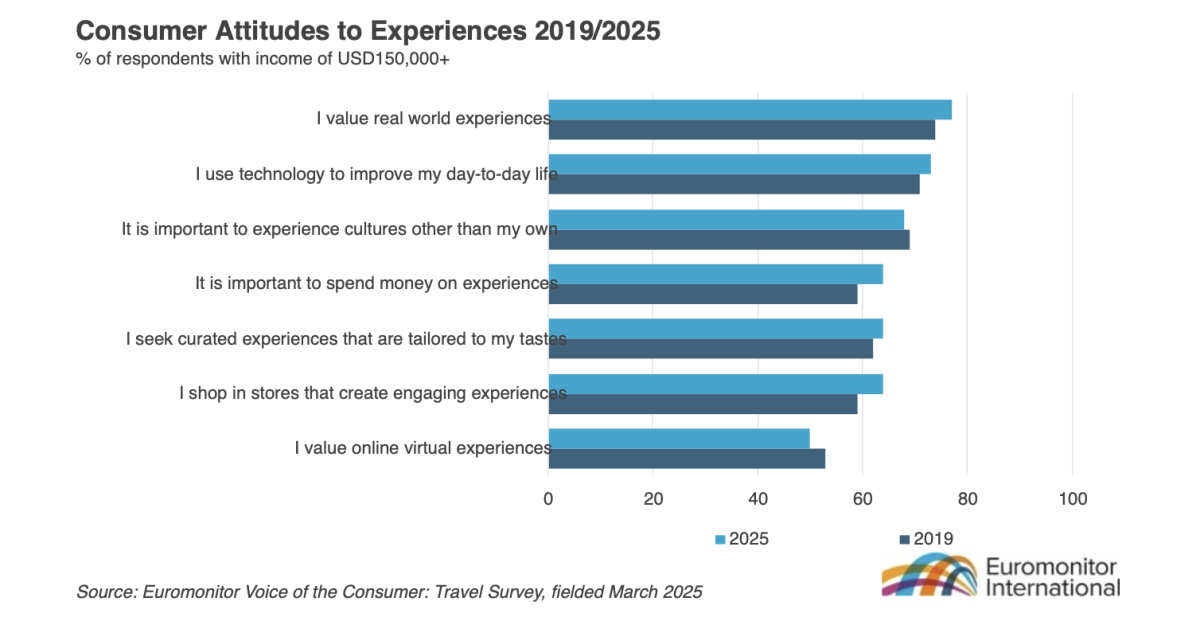 奢侈品消费正在从商品转向体验。虽然2025年个人奢侈品消费略有下降,但包括旅游、健康和酒店在内的体验式奢侈品增长了8%,达到1034亿美元。