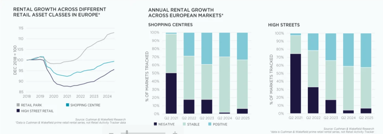 欧洲所有零售资产类别租金均实现增长,其中欧洲商业街租金同比增幅最高(+4%),高于零售公园(+3.5%)和购物中心(+1.9%)。欧洲顶级商业街租金涨幅尤为显著,该区域客流量持续改善,零售商竞相抢占黄金地段。与此同时,零售公园租金创下历史新高,购物中心租金水平几乎恢复至2018年水平。