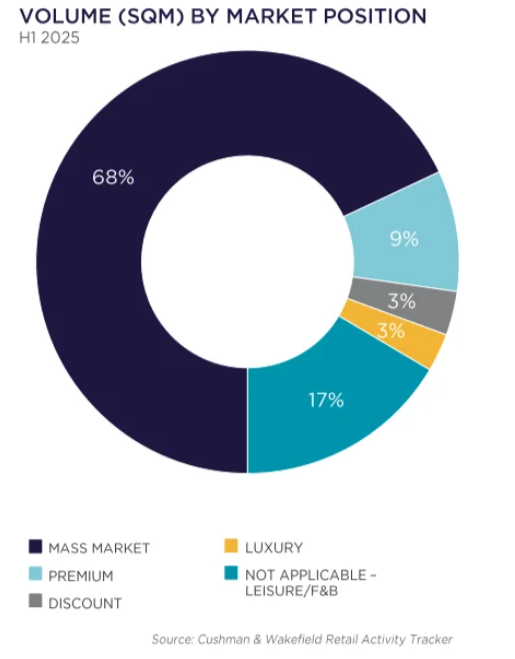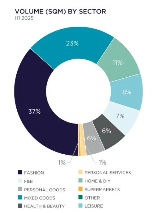 从定位来看,大众市场再次占据零售业绝大多数活动,在1月至6月期间租赁面积和交易量占比近70%。在2025年上半年入驻大众市场的零售商中,时尚零售商占所有交易的三分之一以上,上半年最活跃的时尚品牌包括 Mango、Inditex旗下品牌 Zara和 Massimo Dutti,以及Jack & Jones。 与此同时,奢侈品牌租赁活动显著回升,2025年上半年租赁数量较上年同期增长逾50%。