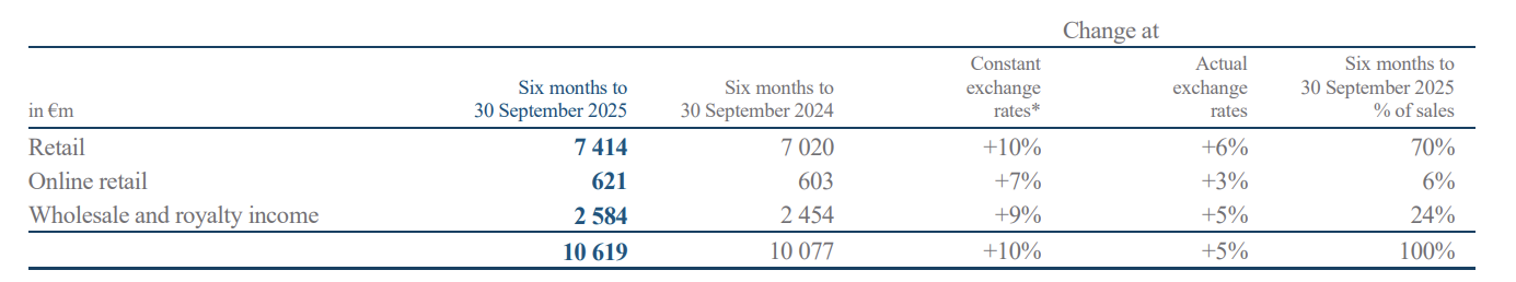 - 零售:包括集团直营店(1,398家)的销售额。上半财年该渠道销售额同比增长了10%,主要由珠宝部门的两位数增长引领。零售渠道仍然是集团销售的最大贡献者,占集团销售额的70%。