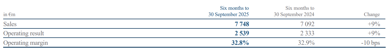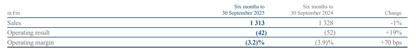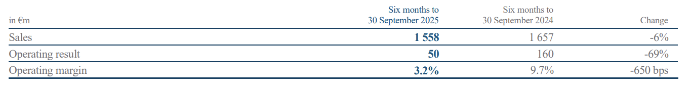 该部门营业利润为5000万欧元,低于去年同期的1.6亿欧元。这反映了不利的汇率波动、黄金价格上涨以及(在较小程度上)美国关税提高的综合影响。持续的成本控制部分缓解了销售额下降对固定运营结构的影响。营业利润率为销售额的3.2%。