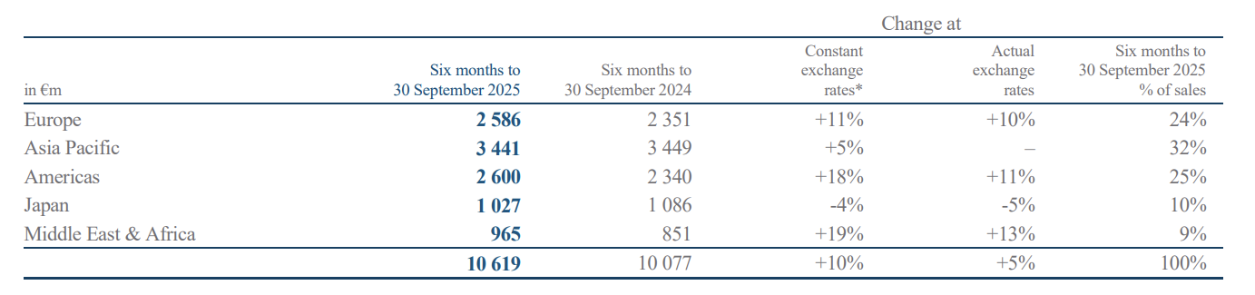 上半财年,除日本外,所有地区均实现增长。美洲、欧洲、中东及非洲均录得两位数的增长。值得注意的是,中国内地、香港和澳门合计,以及日本,均在第二季度恢复增长。