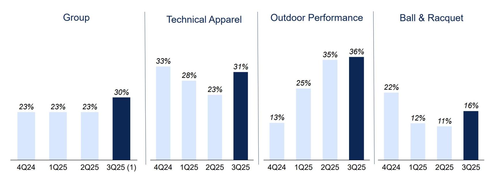 - 山地户外服饰及装备(以萨洛蒙 Salomon 为主): 营收同比增长 36% 至 7.24 亿美元。增长主要归功于 Salomon 鞋类业务持续强劲的势头和冬季运动装备的强劲表现。
