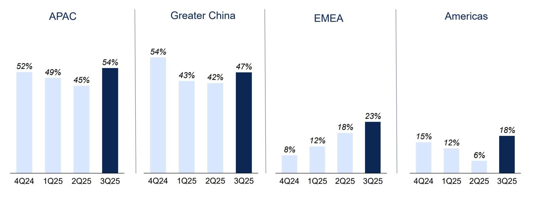 大中华区营收同比增长47%至4.62亿美元,增速由第一季度的43%、第二季度的42%进一步提高至47%,集团指出强劲势头延续至 2025年第四季度。