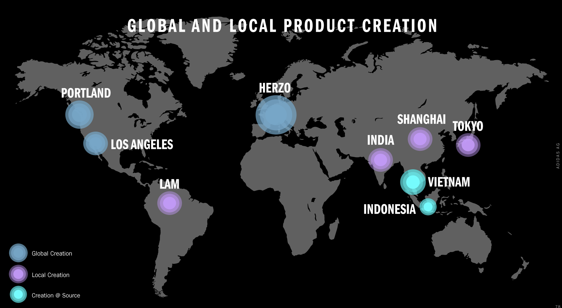 “当涉及到产品开发时,我认为这张幻灯片对你们也很重要,因为我们现在在所有这些中心都在开发产品。这些中心除了承担一部分全球性的开发任务(比如洛杉矶负责篮球和美国运动)之外,当然也有更精准的目标,即为当地消费者提供他们所需的产品,这适用于所有这些中心,你们可以看到现在我们在亚洲有 5 个这样本土化开发中心。结合在中国或印度的本地的生产能力,这种面向当地市场的上市速度(speed to market),当然要比面向欧洲和美国快得多,因为在欧美你的生产很少,而且实际上很难找到能够为你制造鞋类的供应链。”