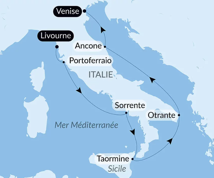 值得一提的是,这条路线还将经过几个标志性景点,包括托斯卡纳海岸、威尼斯潟湖、波尔托费拉里奥的葡萄园、卡普里的索伦托悬崖、奥特朗托的教堂和陶尔米纳的古剧场等。