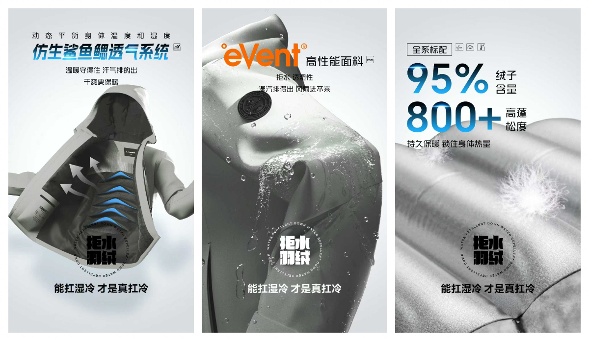 基于这一技术突破,利郎率先提出“抗湿冷羽绒”全新产品定位,系统性地针对低温潮湿环境,构建从面料、羽绒到工艺的整体抗湿冷解决方案。此举不仅是对产品功能的重新定义,更旨在开辟羽绒服细分市场的新赛道,满足南方湿冷地区、户外运动、雨雪天气等多场景穿着需求。