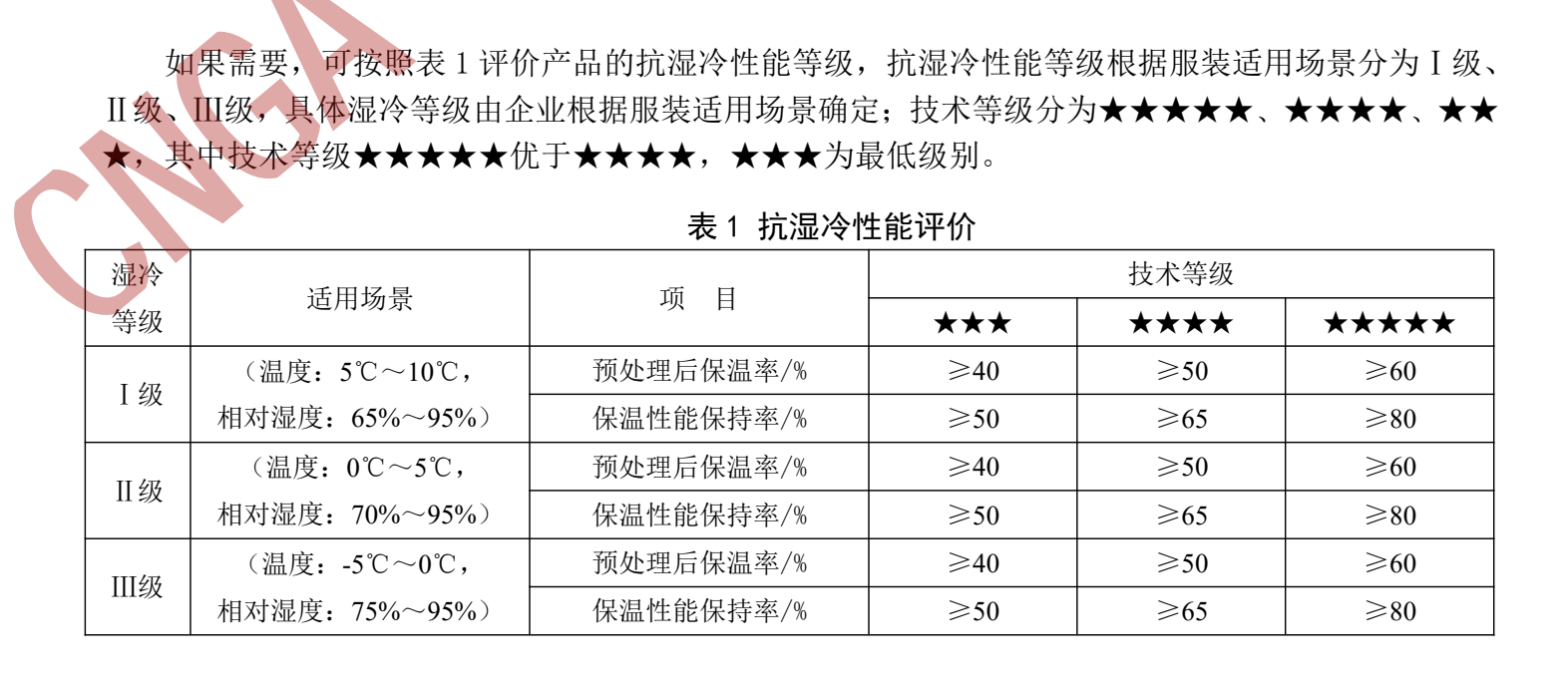 对羽绒服的抗湿冷性能,新标准在“中国天气湿冷分级系统”基础上,围绕温度和相对湿度(RH, Relative Humidity)两项维度,将羽绒服能够抵抗的天气湿冷程度由低到高划分为 Ⅰ、Ⅱ、Ⅲ 三个等级(下图节选自 T/CNGA 87-2025《羽绒服装抗湿冷性能的检测和评价》),建立了一套科学、可操作的抗湿冷性能测试与评价体系。