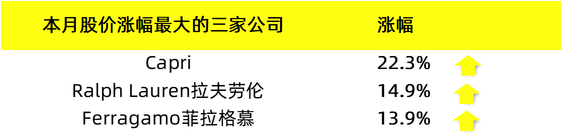 总体而言,2025年11月,“华丽志奢侈品行业股票指数”跟踪的27只股票有12只上涨(其中5只涨幅超过10%),Michael Kors 和 Jimmy Choo 的母公司、美国轻奢集团Capri 涨幅最大(+22.3%),美国奢侈品集团 Ralph Lauren 拉夫劳伦(+14.9%)和意大利奢侈品集团 Ferragamo 菲拉格慕(+13.9%)紧随其后。