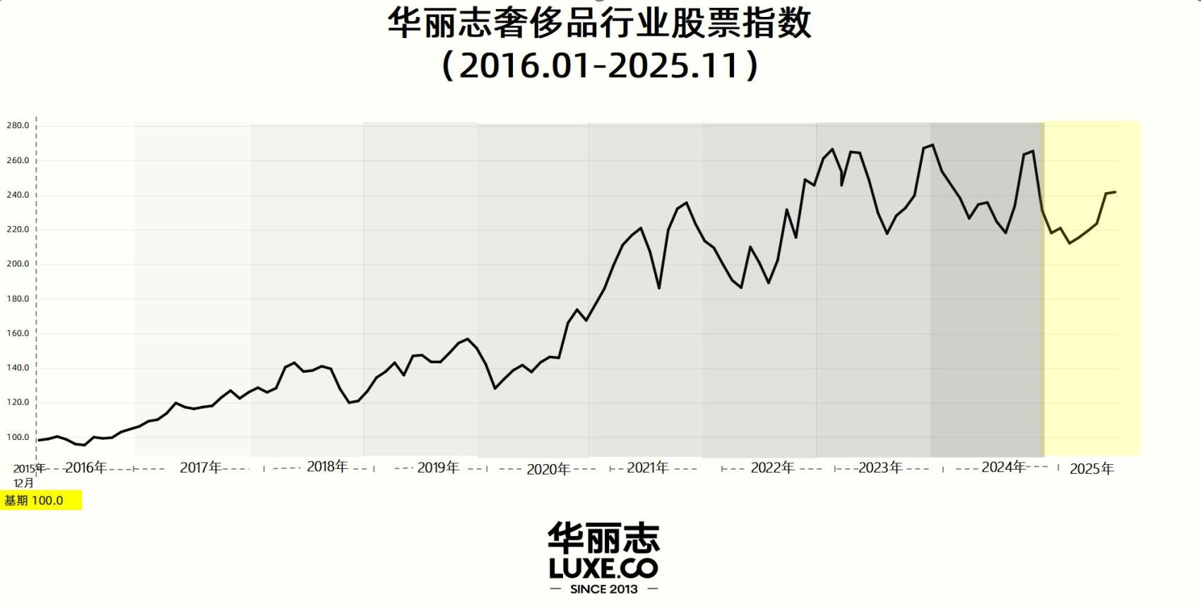 和10月底相比,11月底的“华丽志奢侈品行业股票指数”微涨0.4%至 241.9,迎来五连涨。