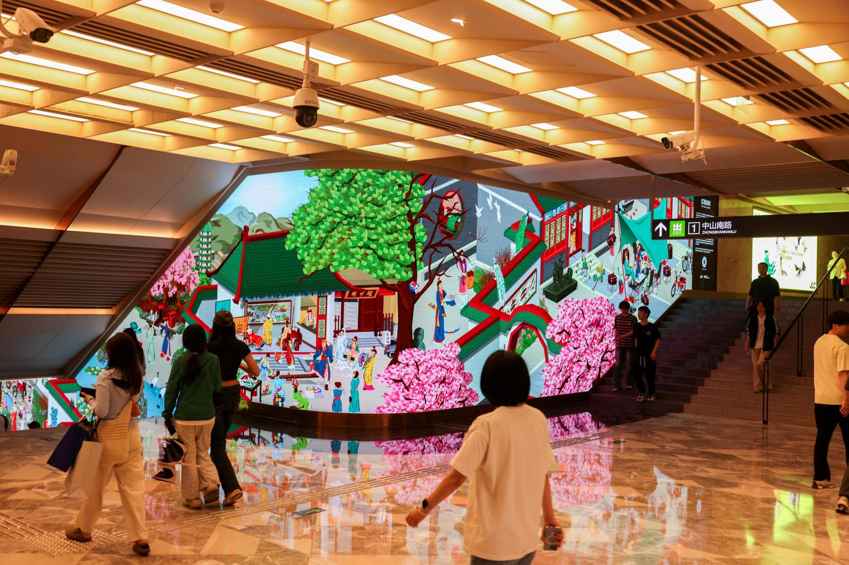 南京JLC东西区B1连通道处打造有一片《时空列车》,使人流量巨大的地铁连廊化身“南京最美通道”。长廊采用大面积玻璃幕墙和弧形结构,营造出强烈的科技感和现代美学,场景动态变幻如海底、沙丘、草野等自然景观,现实与幻象交织,如梦似幻。