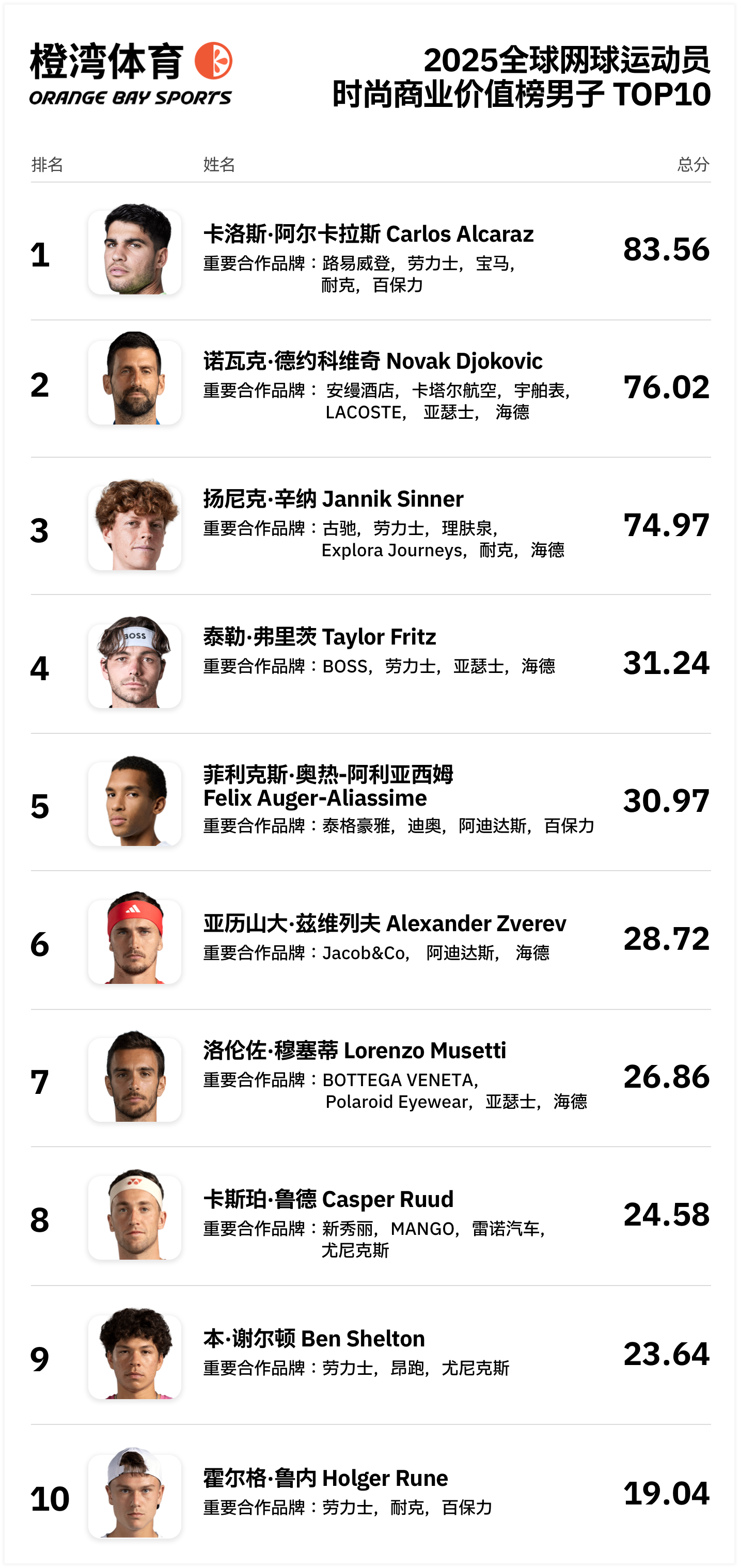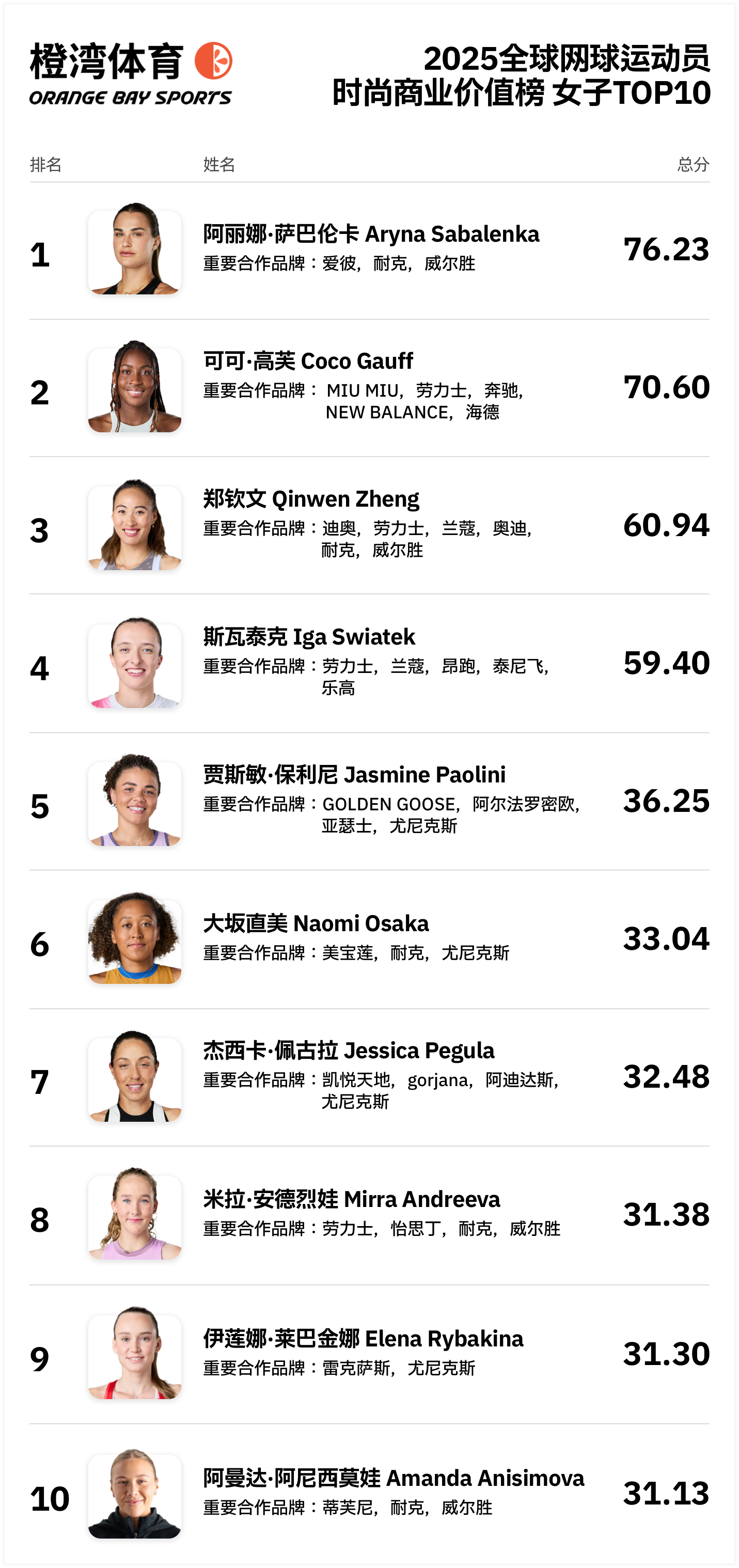 2025年12月,橙湾体育(Orange Bay Sports)推出年度榜单《2025全球网球运动员时尚商业价值榜》——榜单共分为女子前十名和男子前十名两部分。
