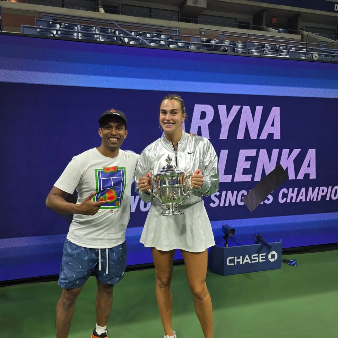 上图:Shane Liyanage(左)与萨巴伦卡(右)庆祝2025年美网夺冠