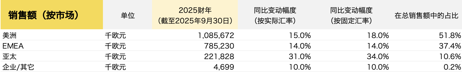 同时,尽管受全年汇率换算及关税影响,整体业绩面临70个基点的压力,但2025财年调整后 EBITDA 利润率仍达31.8%,触及31.3%~31.8% 指引区间的上限。