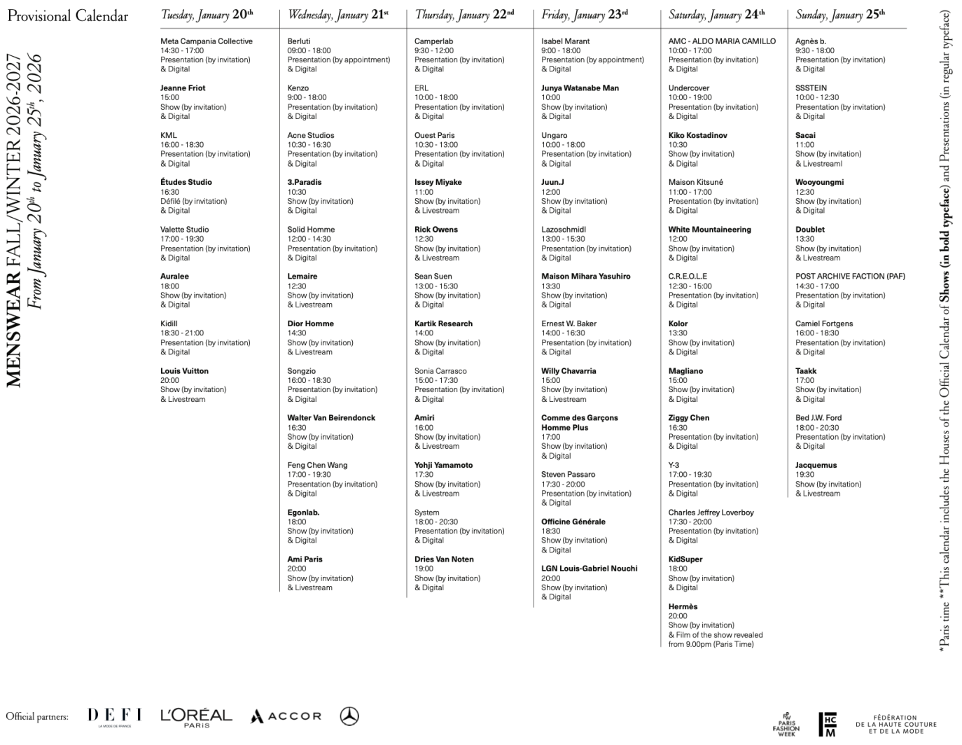 法国高级定制和时装联合会(France’s Fédération de la Haute Couture et de la Mode)公布了2026秋冬巴黎男装周的初步日程安排。