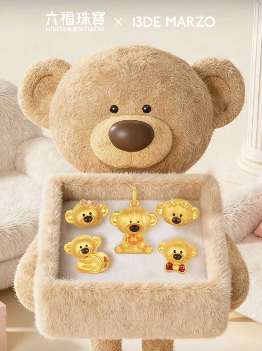 35)服装品牌 13DE MARZO(ERIC & LESLIE)与六福珠宝合作推出联名饰品,将其标志性玩偶元素融入珠宝设计之中。
