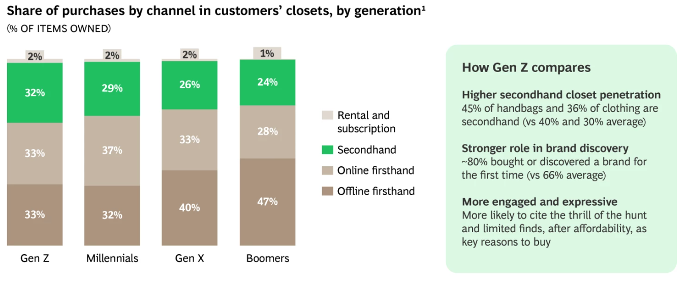 对他们而言,二手商品是精心打造的时尚体验的延伸。他们也更倾向于购买真正奢侈品牌的高端产品,这些品牌通常会保留溢价,甚至以高于零售价的价格出售,尤其是在商品售罄或限量发售的情况下。