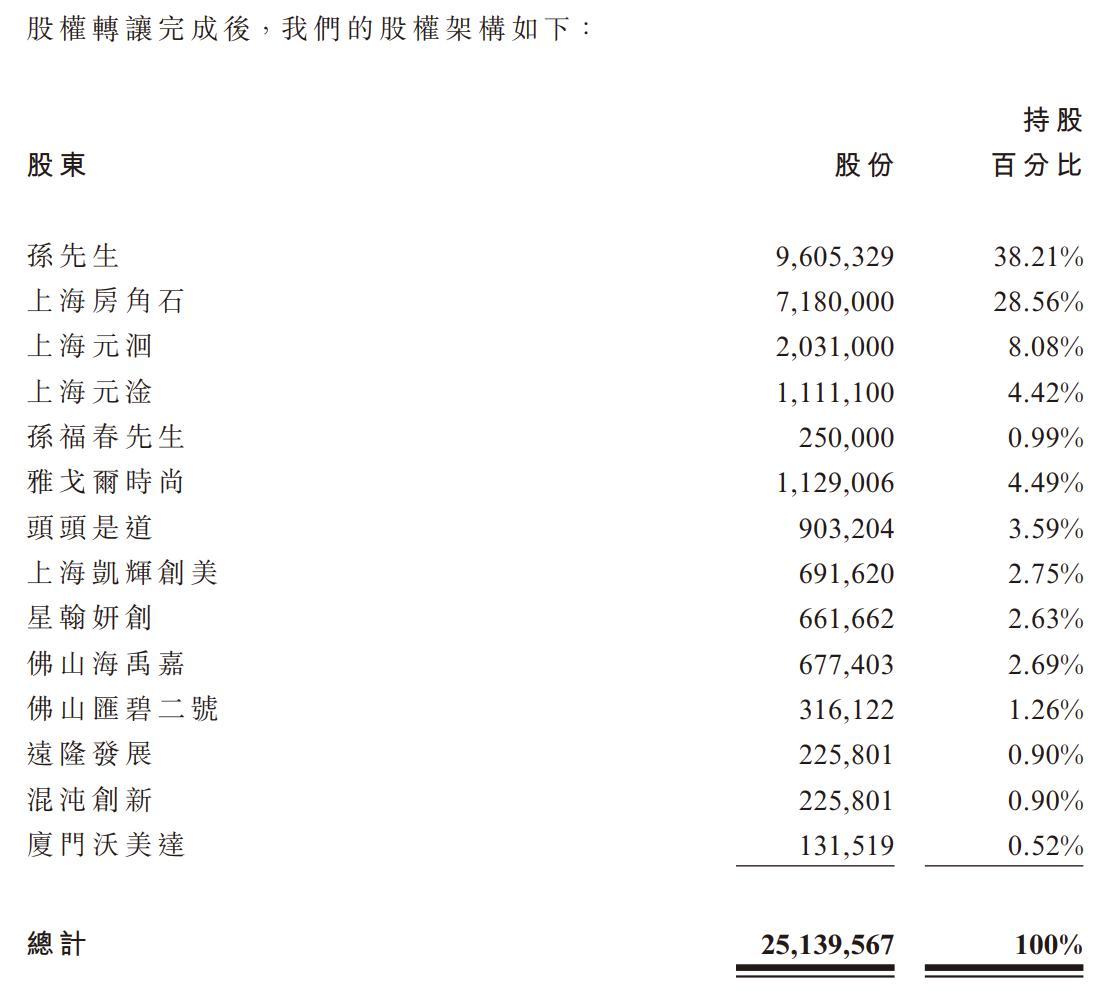 上市前,创始人孙来春直接持有(38.21%)及透过上海房角石(28.56%)、上海元洄(8.08%)以及上海元淦(4.42%)间接持有已发行股本合计约79.27%的权益。紧随全球发售完成后(假设超额配股权未获行使),孙来春及其一致行动人构成的控股股东组别控制约71.34%的投票权。