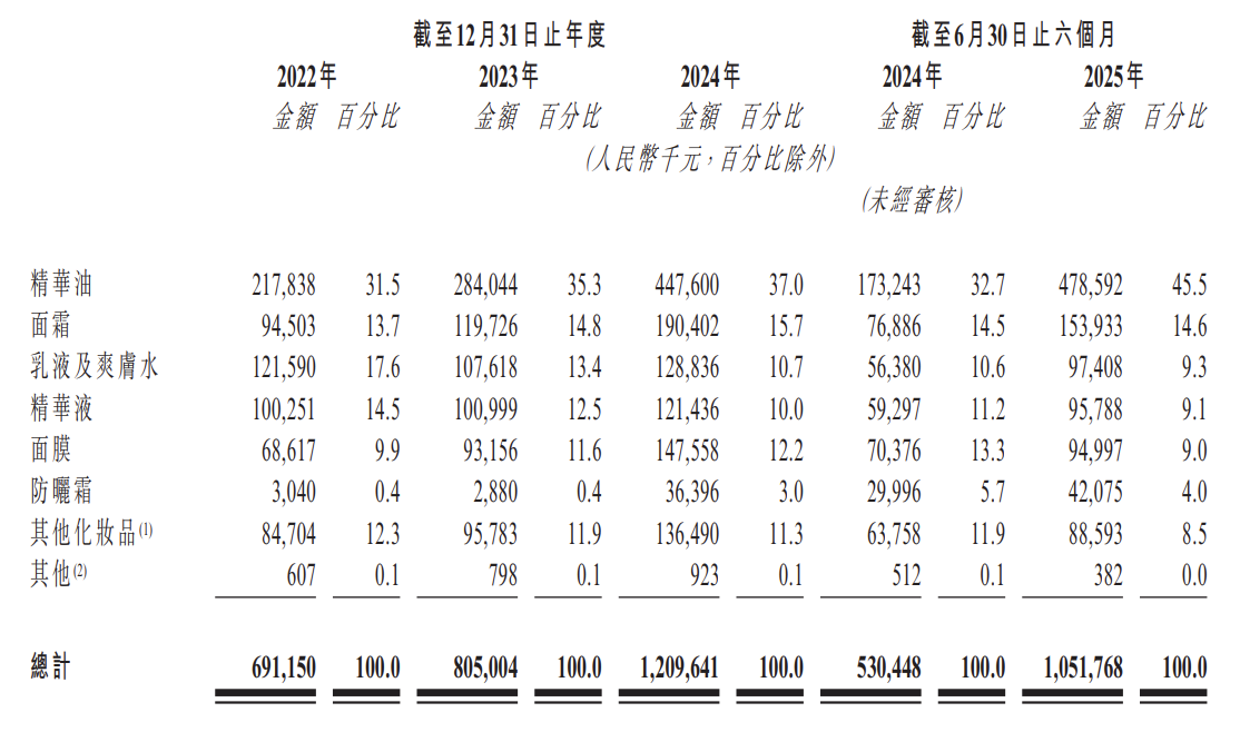 其标志性的山茶花精华油截至2025年6月30日已累计销售逾4,500万瓶。精华油对公司营收的贡献由2022年的31.5%提升至2025上半年的45.5%。此外,按全渠道销售的总零售额计,该产品自2014年以来连续11年于所有面部精华油产品中位居全国榜首。