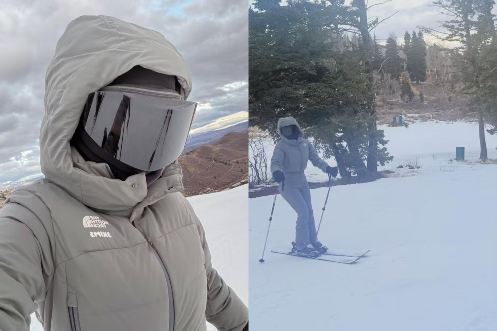 上图:金·卡戴珊身着 SKIMS 与 The North Face联名系列滑雪