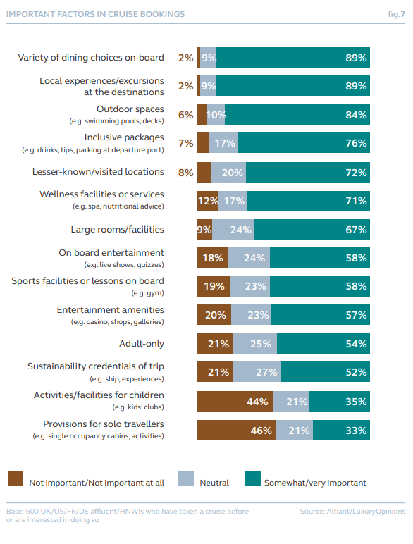在选择航线时,丰富的餐饮选择、目的地当地游览项目以及泳池区等户外空间,对富裕旅客而言尤为重要。