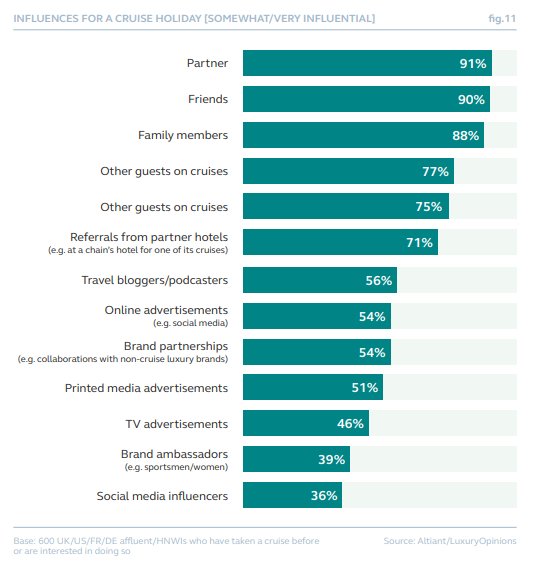 亲友是决定邮轮假期选择时最具影响力的群体。但其他乘客(77%)和旅行社/顾问(75%)同样能发挥关键作用。