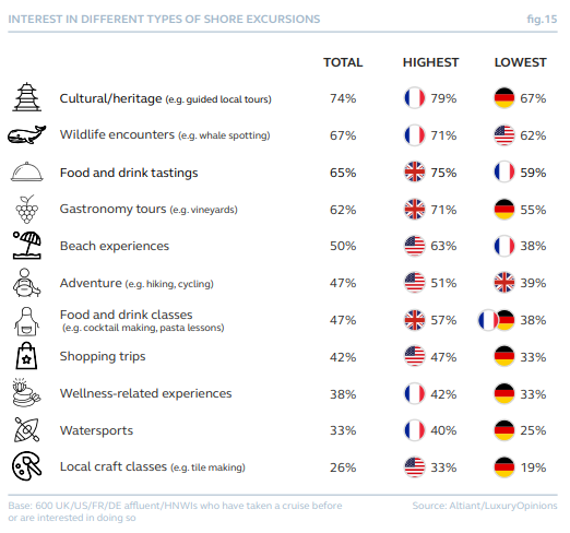 岸上观光对多数邮轮旅客极具吸引力,其中文化/遗产类(74%)、野生动物类(67%)及美食品鉴类(65%)最受青睐。