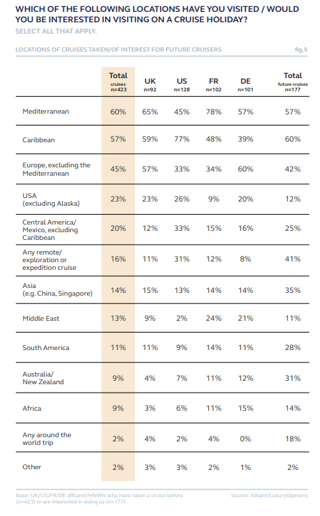 地中海(60%)和加勒比海(57%)是受访邮轮旅客中最受欢迎的目的地,其中富裕的法国人和美国人选择这两地的比例均升至约四分之三。